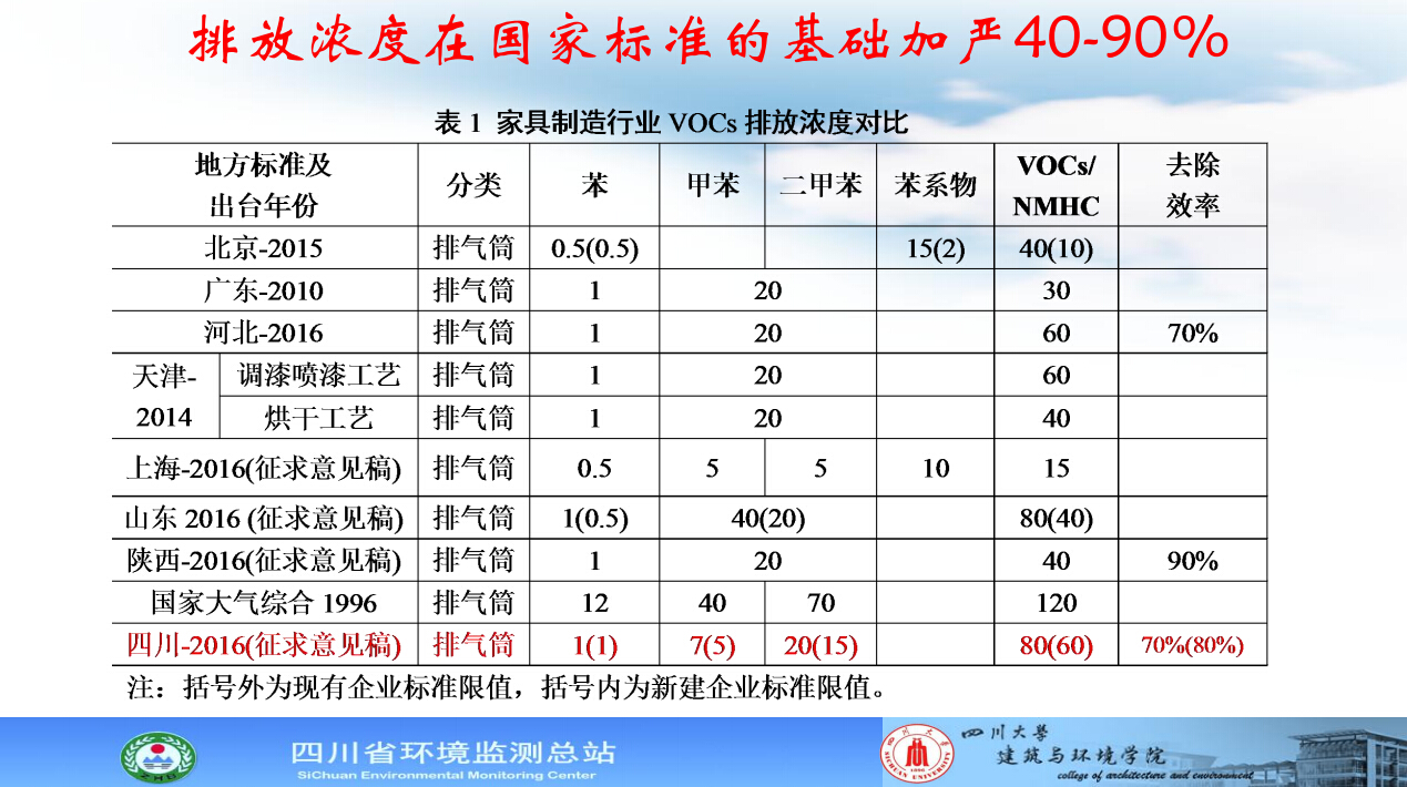 为此环保部门将提高环境执法能力,进一步加大执法力度,依法严惩暗管排污、非法处置危险废弃物和有毒物、不正常运行和使用治污设施、伪造或篡改环境监测数据等恶意违法行为。规定了10个重点行业的VOCs排放限值和控制要求,包括了木质家具制造、印刷、石油炼制与石油化学、涂料、油墨及类似产品制造、橡胶制品制造、汽车制造、表面涂装、农药制造、医药制造。电子产品制造行业,涵盖了全省工业企业80%以上的VOCs排放总量。新排放标准更加严格,苯、甲苯、二甲苯、非甲烷总烃的排放浓度在国家综合排放标准的基础上分别加严了92%、87%、78%、50%,排放速率在国家排放标准的基础加严50%-80%。