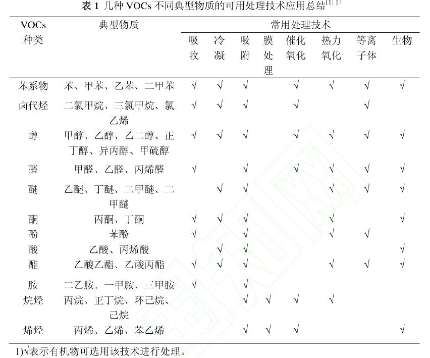 VOCs气体处理技术主要分为两类:回收和消除。表1选择具有代表性的多种处理技术在多种VOCs中的应用情况进行归纳。