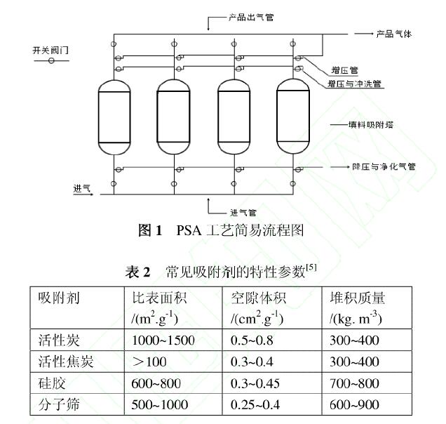新型变压吸附(PressureSwingAdsorption,PSA)技术在国外运行比较成熟,该工艺一般在气体压力为0.1~2.5MPa之间运行,但有些含气源无需二次加压。李立清等采用PSA技术对单相气体污染物(甲烷、氯氟烃、苯)进行回收,其处理回收率能达到99%,该研究成果可为PSA的工程运行提供参考。日本Bell公司运用PSA技术分离乙醇-水体系,将分压为44676Pa和1679Pa的水与乙醇双组分与混合气输入活性炭吸附床,在加压/常温条件下进行吸附。经第一次减压进行脱附富水蒸气处理,再经第二次减压进行脱附高纯度乙醇蒸气处理,最终将第二次解吸气体冷却至-20℃,即可回收98%乙醇产品,将该方技术运用至酒精发酵净化浓缩传统工艺中,可使能耗减少50%。深入研究及开发新型吸附剂是PSA技术的重点,图1为PSA工艺简易流程图。常见的吸附材料特性如表所示,其中新型材料(沸石分子筛吸附剂)因其高吸附性、无污染性而在国际上越来越受青睐。WeiL等使用粉煤灰合成高效沸石分子筛。在投加10mol/LNaOH、结晶温度140℃及结晶时间8h条件下,所合成沸石分子筛的Si/Al比为7.9,对苯气体的吸附率高达66.51%。在沸石合成中,碱度、Si/Al比、时间和温度的增加将影响苯气的吸附效果。Mukerjee等[7]将煤基活性炭吸附剂浸渍在KI3里,在全碘吸附容器LX-100中,探究正常和限制操作温度下甲基碘的去污因素。结果表明,吸附处理后碘残留量小于0.5μgml-1,煤基活性炭去除稳定碘的去污因子大于1000。