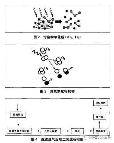 (1)旋流板塔。炼胶废气通过袋式过滤器后,仍残余一定量的固相的炭黑等颗粒物及油性状物质。旋流板塔的主要作用是去除废气中的颗粒物和油性物质,以保障后续系统的正常运行。根据炼胶废气的一般特性,炼图2污染物氧化成CO、H2O胶废气通常含有一定量的固相颗粒物及油性状物质,这些物质对等离子体装置和光化学氧化装置的效率和使用寿命具有一定的影响。本项目中,为保证等离子体装置和光化学氧化装置的正常运行,顺利实现废气的净化,炼胶3#密炼机生产的废气先进入位于最前端的微旋流器,去除气体中颗粒物和油性物质。