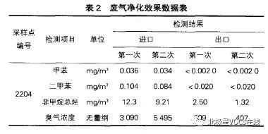 上述结果得出,非甲烷总烃去除率为80%,臭气浓度去除率为90%。由于研究的是实际轮胎厂密炼机排放的废气,其中各组分的浓度波动比较大。以上数据以平均数为判断依据。